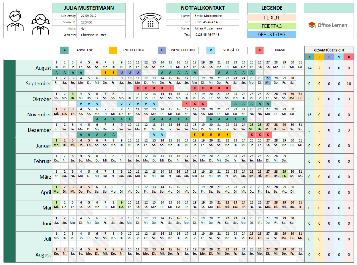 An- und Abwesenheitsplaner Schule für Microsoft Excel