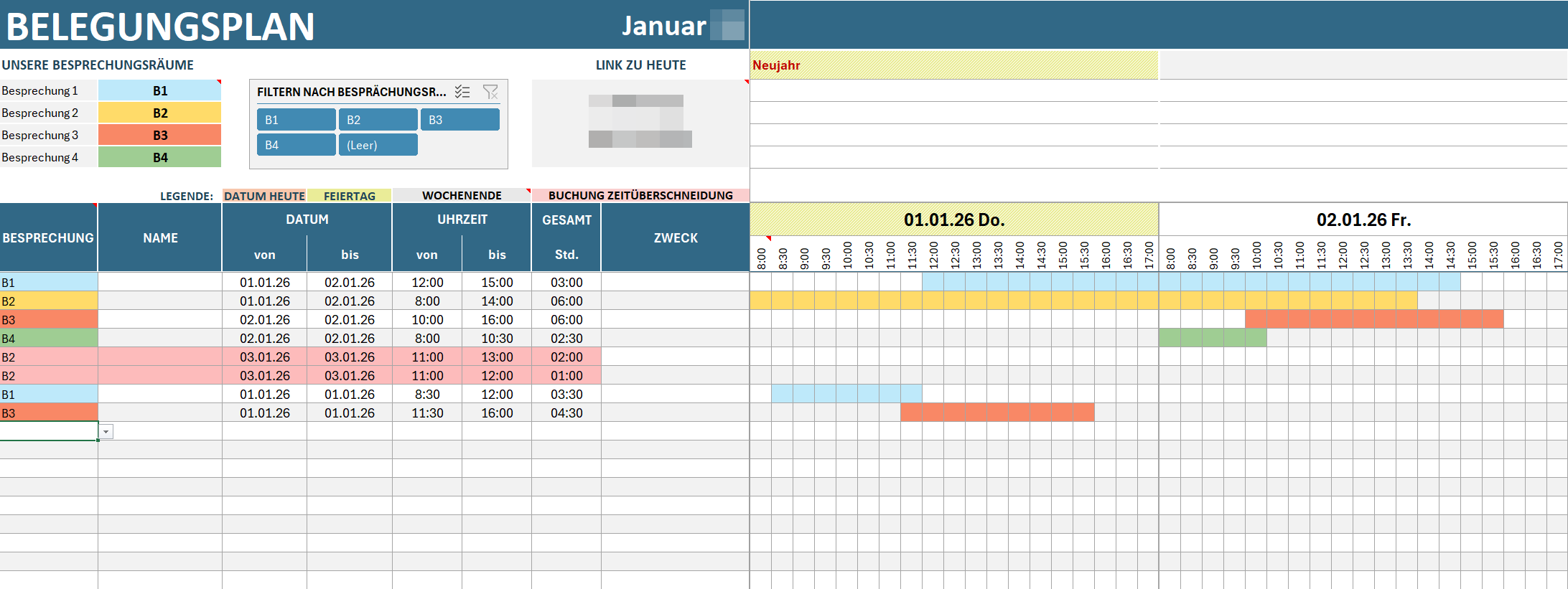 Belegungsplan Vorlage für Besprechungsräume 2026 für Microsoft Excel