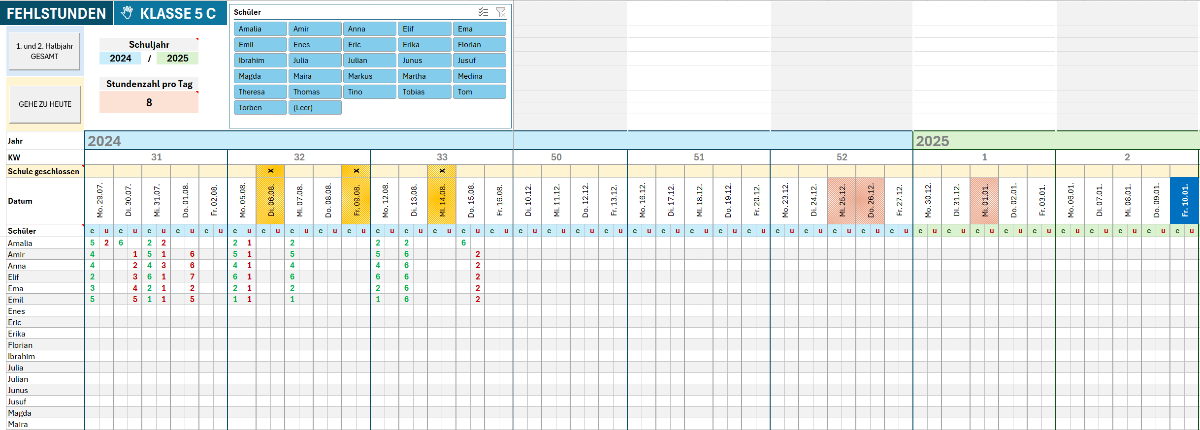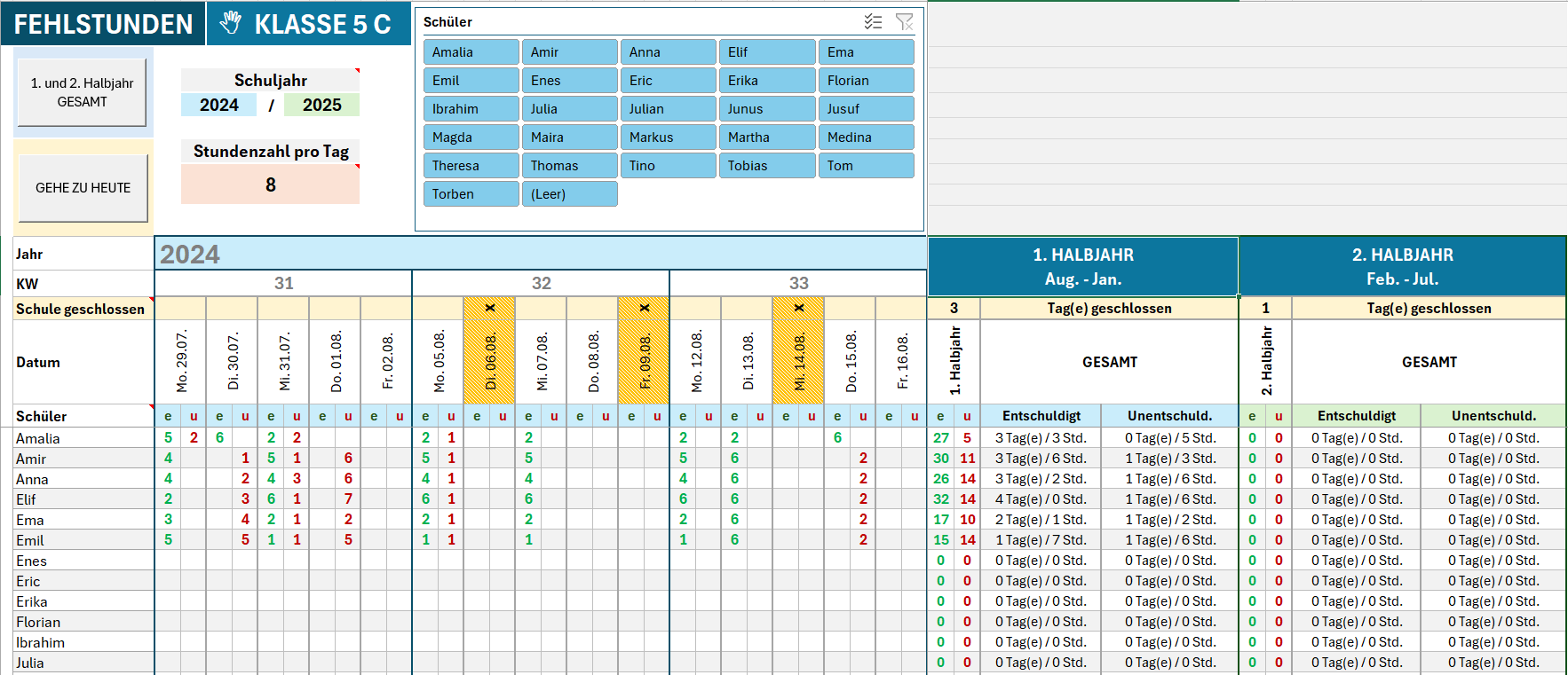 Vorlage zur Verwaltung von Fehlstunden von Schülern mit Feiertagen für Microsoft Excel
