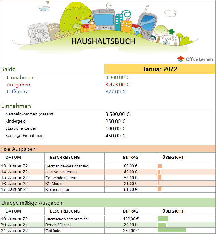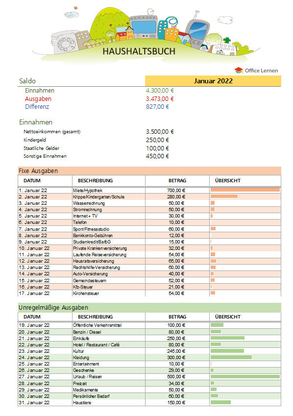 Mit unserer Vorlage führen Sie ganz einfach selbst ein Haushaltsbuch. Dazu geben Sie in der fertigen Vorlage Ihre Einkünfte, Fixe und unregelmäßige Ausgaben und schon haben Sie eine klare Übersicht.