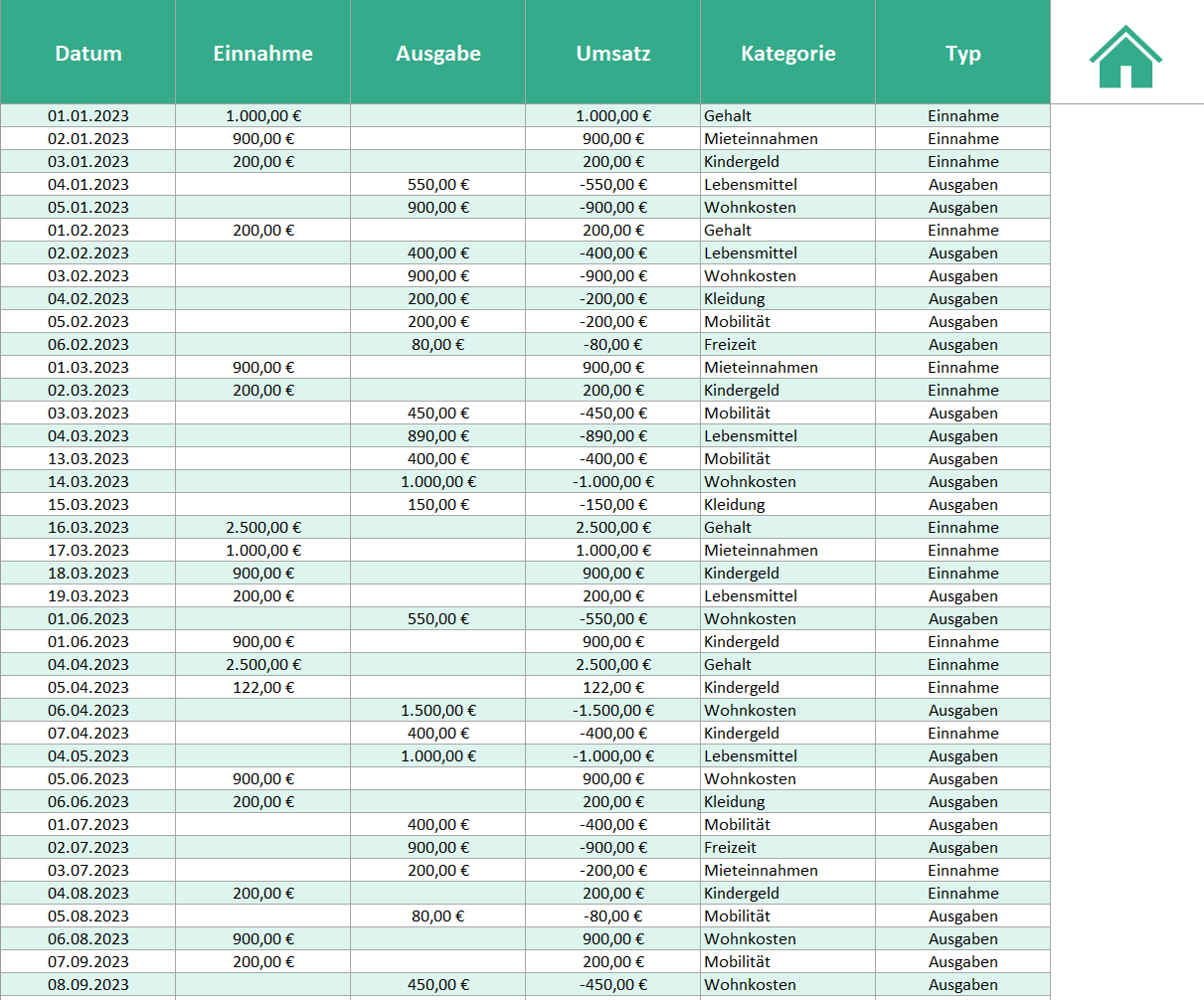 Unsere Haushaltsbuch-Vorlage hilft Ihnen ganz einfach selbst ein Haushaltsbuch zu führen. Dazu geben Sie in den Tabellenblatt "Einnahmen und Ausgaben" alle Ihre Einnahmen sowie Ausgaben ein. Die Kategorie können Sie ganz einfach per Dropdown auswählen. Das Dashboard hilft Ihnen eine klare Übersicht über Ihre Einnahmen, Ausgaben, Ersparnisse etc. zu behalten. Für bessere Übersicht können Sie auch per Klick auf die Monate das Dashboard filtern oder pro Kategorie Ihre Einnahmen sowie Ausgaben anzeigen lassen. Mit unserer Haushaltsbuch-Vorlage lässt sich bestimmt besser das Budget der zukünftigen Monate planen.