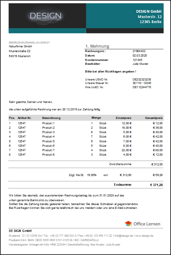 1 x Excel Vorlage Mahnung