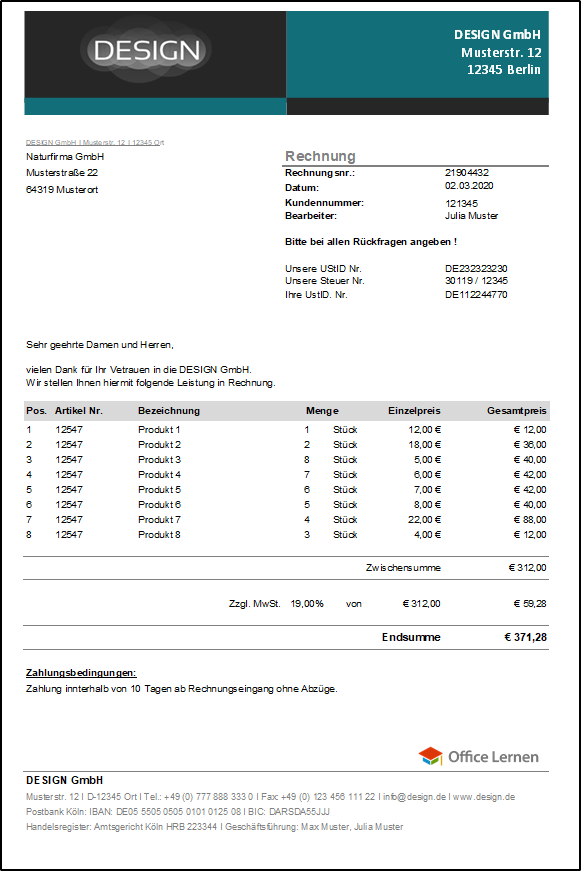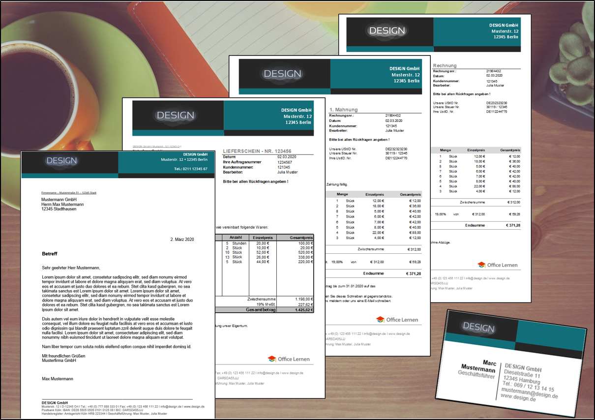 Mit Hilfe der Word oder Excel Vorlagen können Sie im Handumdrehen eine sichere Briefvorlage, Rechnung, Lieferschein, Mahnung sowie Visitenkarte erstellen, die allen rechtlichen Anforderungen entspricht.