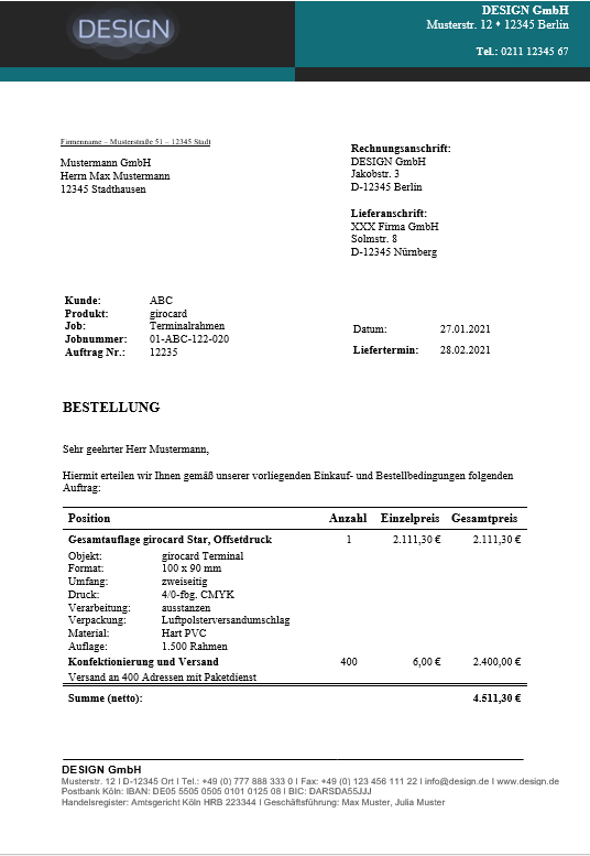 Bestellvorlage für Microsoft Word. Passend für gängige Fensterumschläge.
