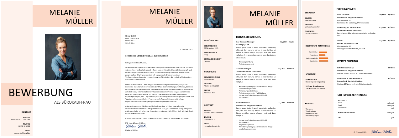 Unsere Bewerbungesvorlagen enthalten alles, was sie für die Bewerbung benötigen: Anschreiben, Deckblatt sowie Lebenslauf.