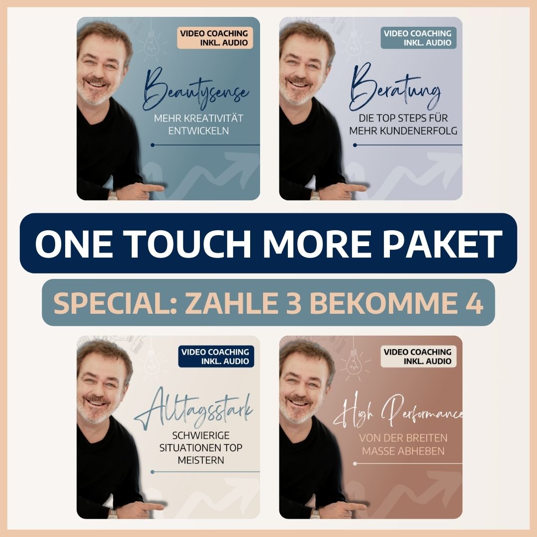 Du musst nicht gleich das gesamte "One Touch More-Videotraining" buchen. Du kannst jedes Training einzeln wählen, um reinzuschnuppern und zu sehen, welches am besten zu deinen Bedürfnissen und denen deines Salonteams passt. So kannst du flexibel diejenigen Themen auswählen, die dir am meisten zusagen.