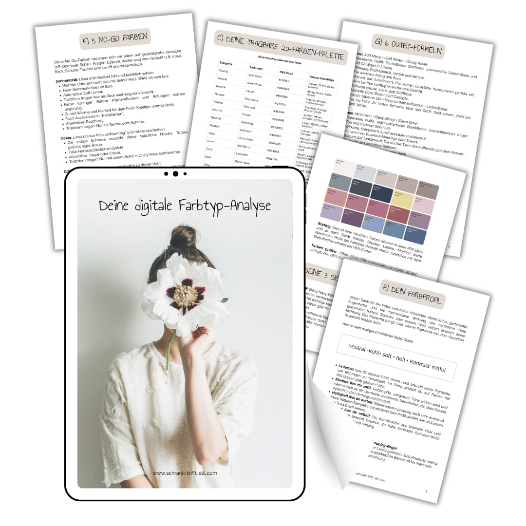 Mit meiner fotobasierten Farbtyp-Analyse bekommst du ein klares Farbprofil plus eine tragbare 20-Farben-Palette und praktische Empfehlungen - damit Kombinieren und Shoppen plötzlich viel leichter wird.