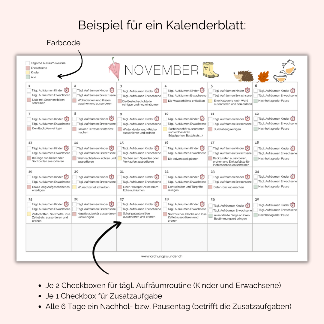 - Der Aufräum-Kalender: 12 Monate tägliche Aufräum-Routine plus kleine Zusatzaufgaben für Eltern und Kinder