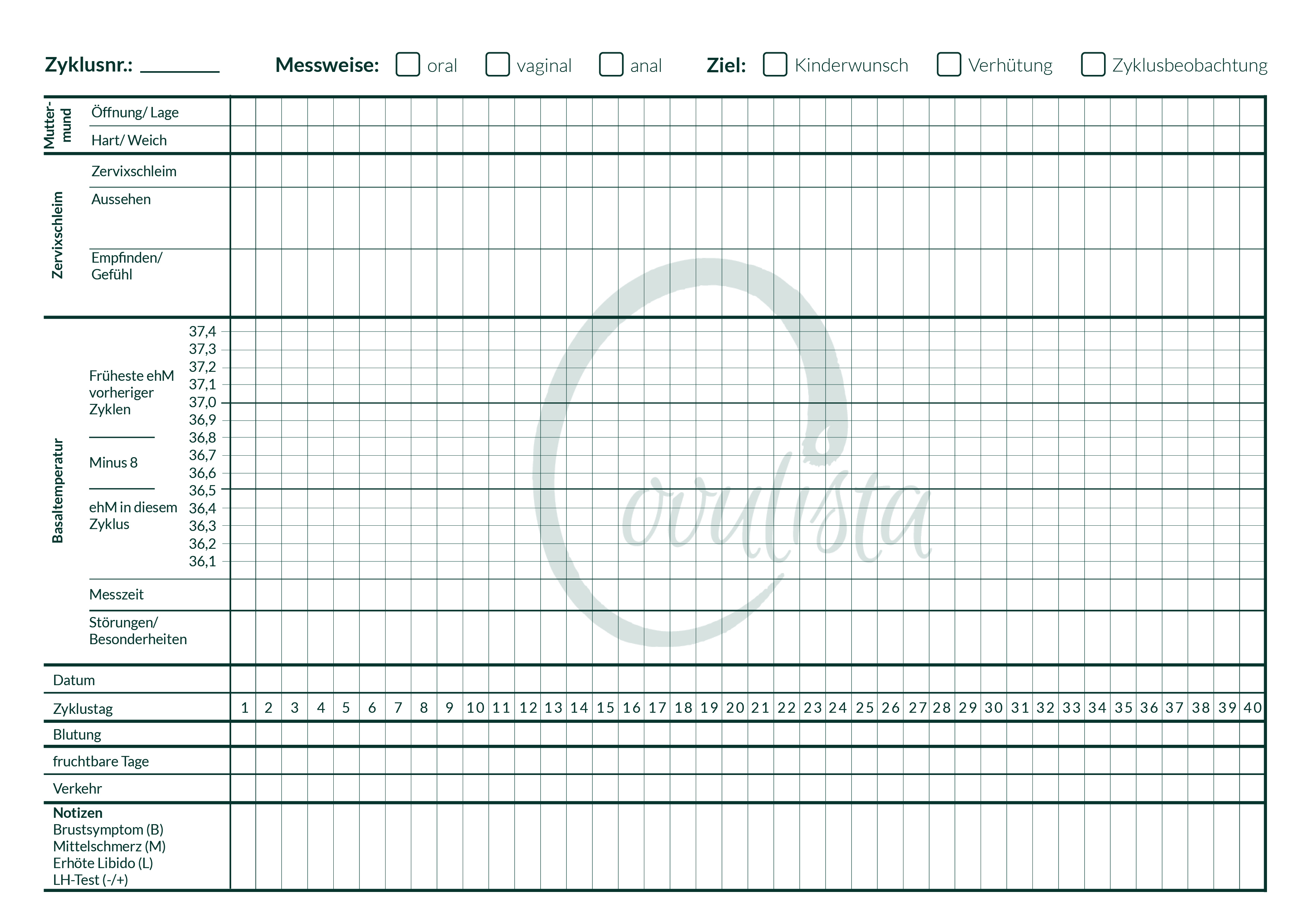 NFP Zyklusblatt für die Aufzeichnung und Auswertung nach der symptothermalen Methode (Natürliche Familienplanung) zur sicheren, hormonfreien Verhütung, bei Kinderwunsch und zur Zyklusbeobachtung.