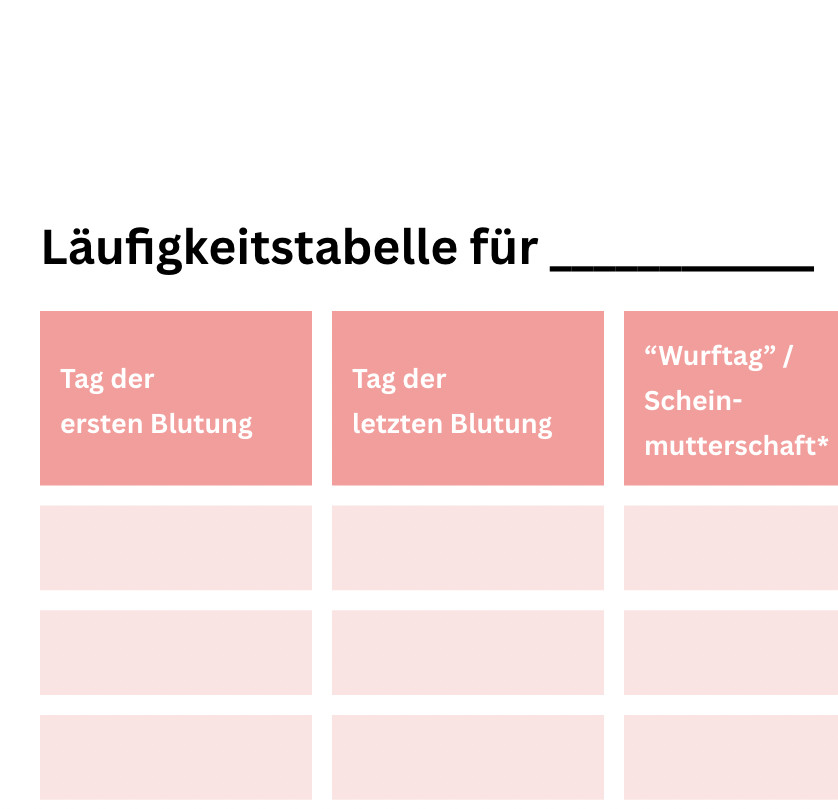 Um zu wissen, ob deine Hündin regelmäßig läufig wird, notiere dir die Läufigkeiten deiner Hündin. Gleichzeitig hilft die Tabelle bei der Urlaubsplanung.
