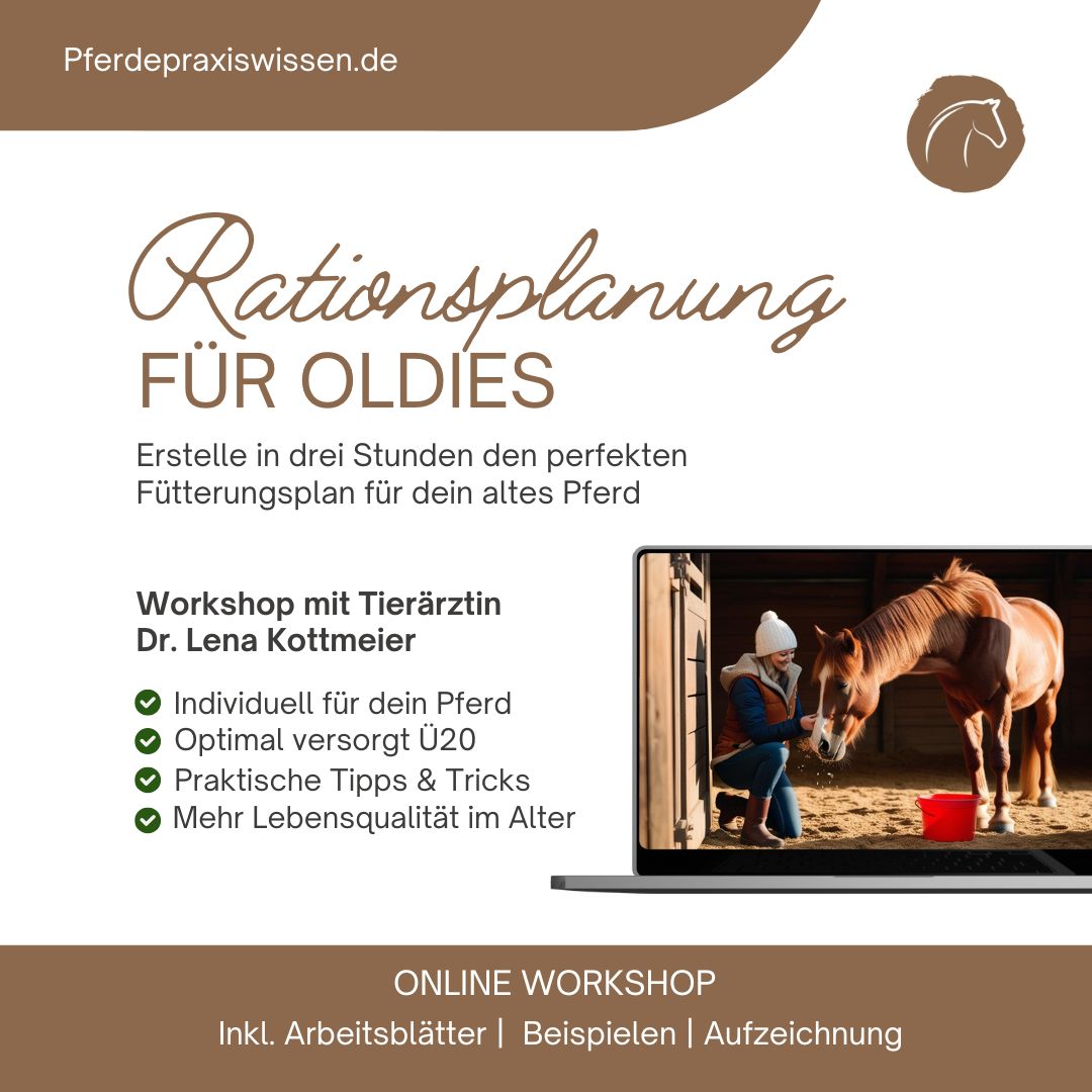 In diesem Fütterungs-Workshop erstellst du in ca 3 Stunden den perfekten Futterplan für deinen Pferdesenior.
