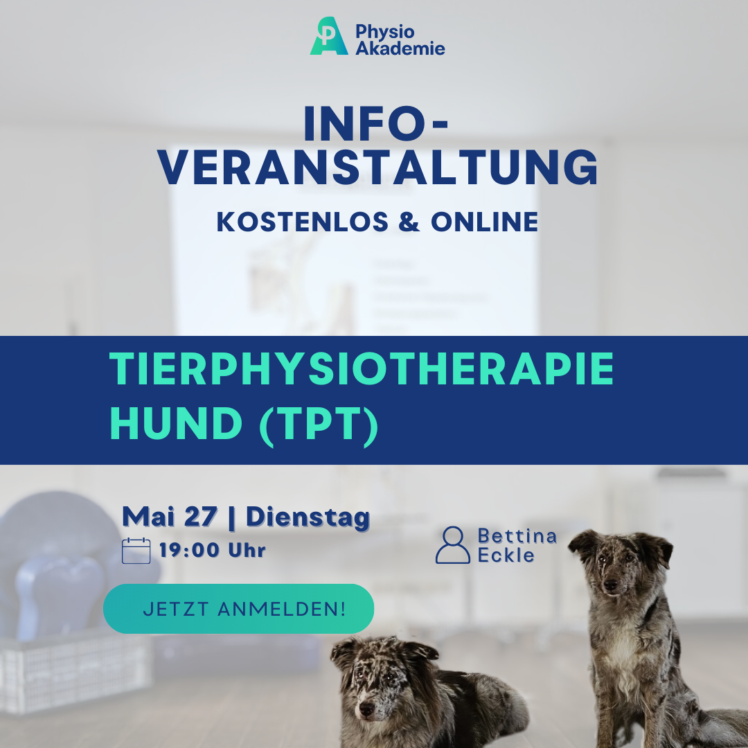 Möchten Sie sich im Bereich Tierphysiotherapie (Fachrichtung Hund) weiterbilden? In dieser kostenlosen Live-Infoveranstaltung erfahren Sie alles über die Weiterbildung zum Tierphysiotherapeuten, die sich gezielt an Physiotherapeut:innen richtet, die ihre Kenntnisse aus dem Humanbereich auf Tiere übertragen möchten.