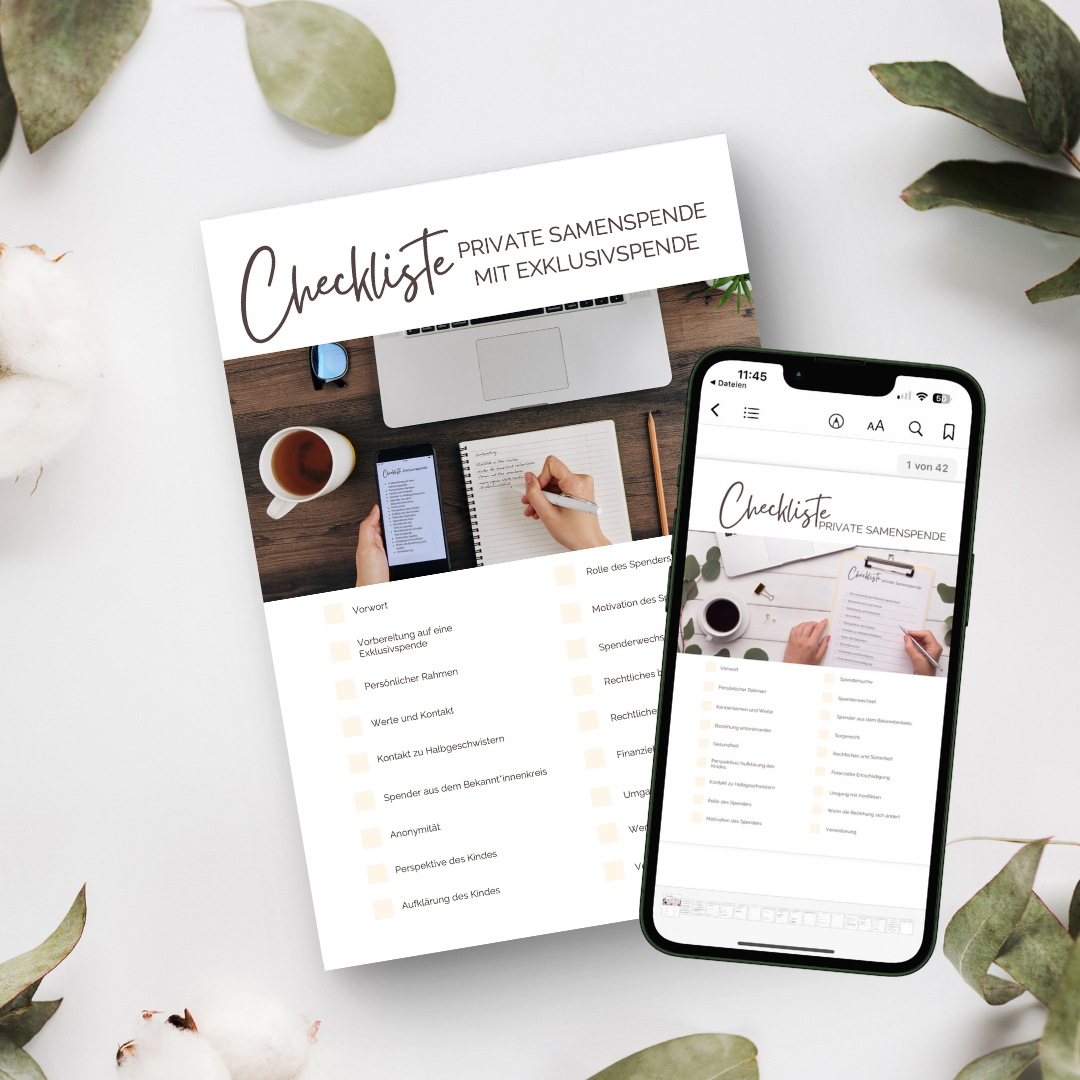 Wenn du eine private Samenspende vorbereitest, sollte dir der Weg der Exklusivspende über eine Samenbank als aktuell rechtlich sicherste Alternative bekannt sein. Damit du die Chance hast, beide Wege zu vergleichen und eine gut informierte Entscheidung gemeinsam mit dem Spender treffen kannst, bieten Katharina Horn und ich dir beide Checklisten als Kombination an.