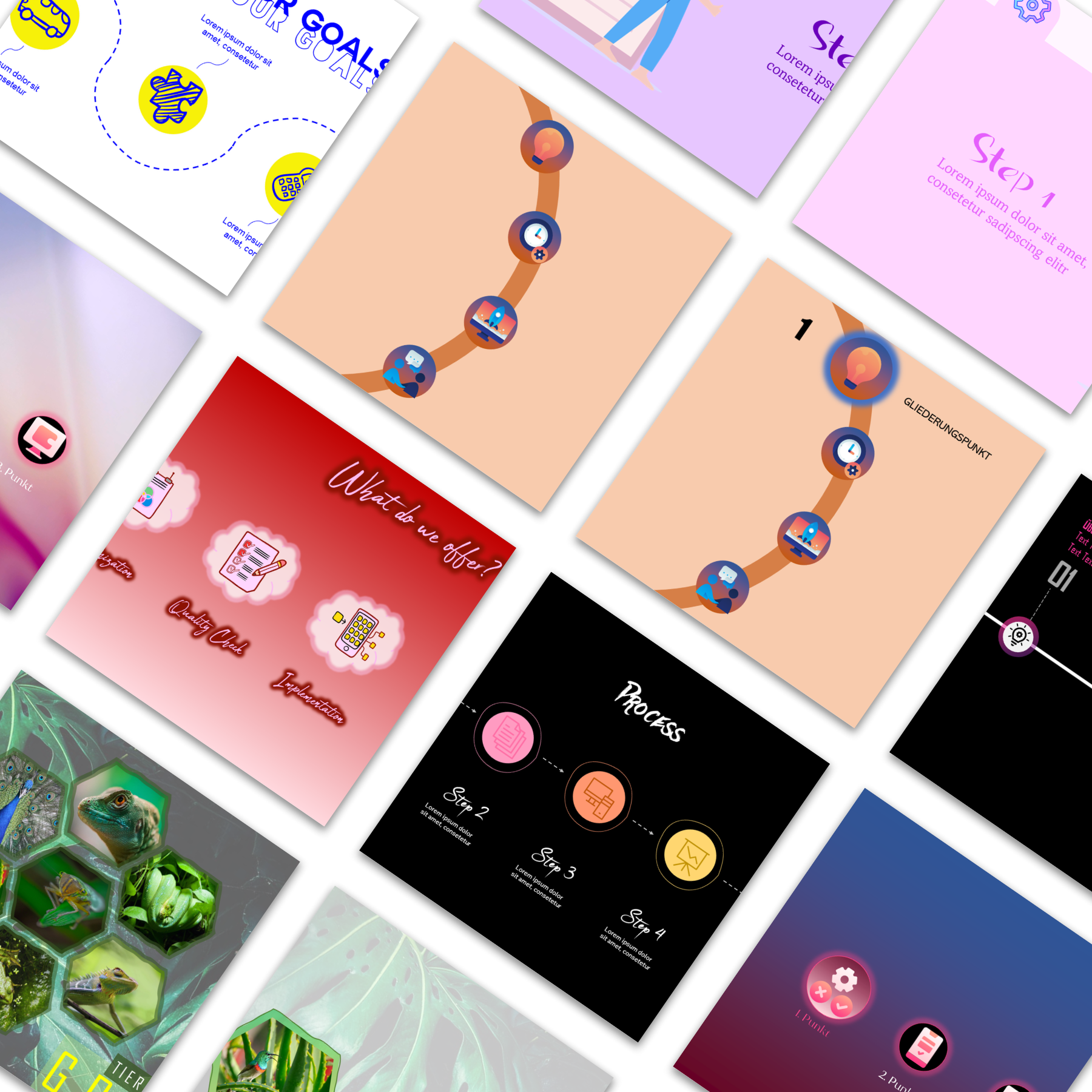 Dieses Template bietet dir 11 innovative Gliederungsdesigns, die nicht nur professionell, sondern auch außergewöhnlich kreativ gestaltet sind.