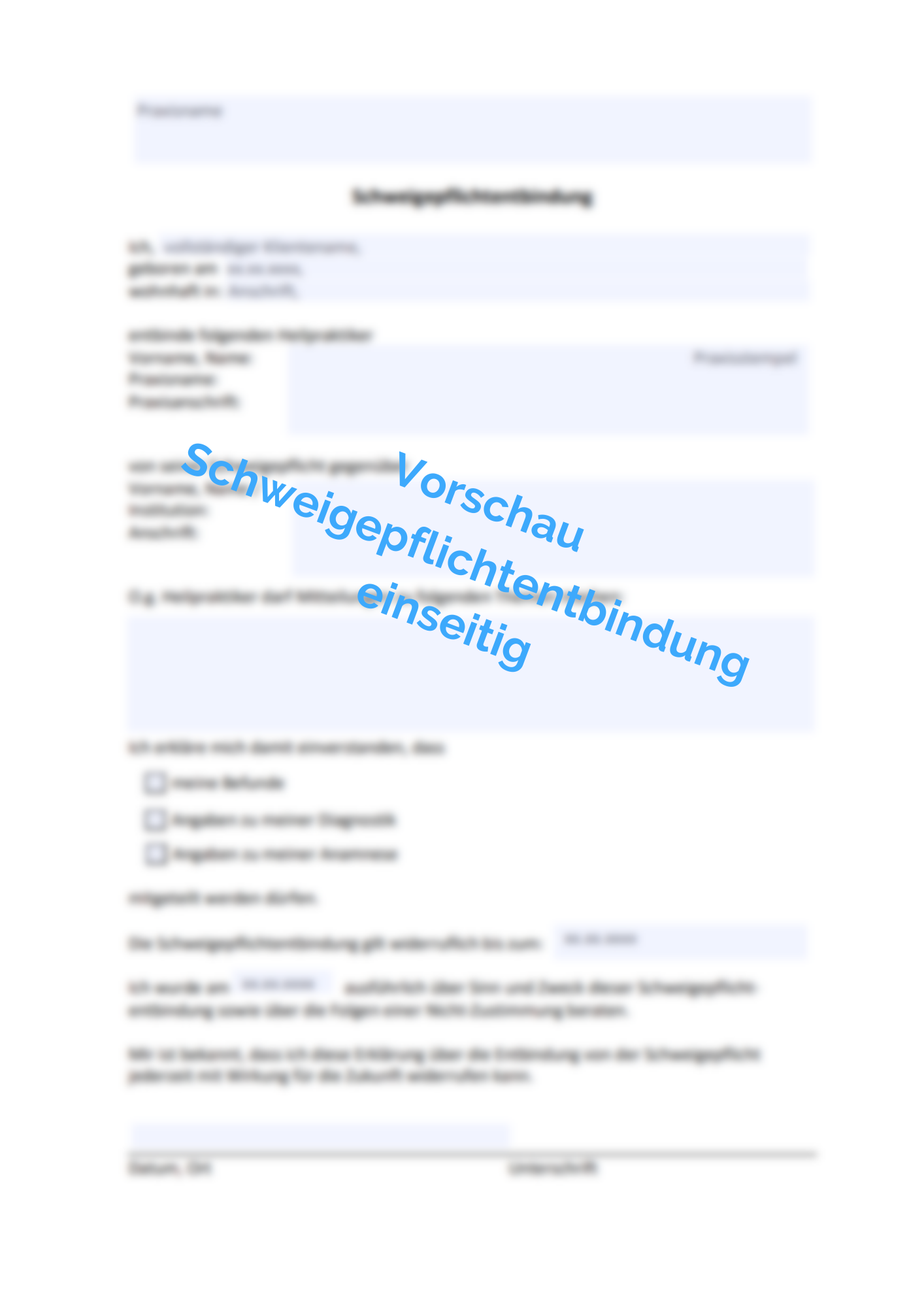 Es handelt sich bei der Schweigepflichtentbindung im DIN A 4 -Format um eine einseitige PDF, die Sie digital ausfüllen können oder sich mehrmals ausdrucken können, um die Daten manuell zu erfassen.