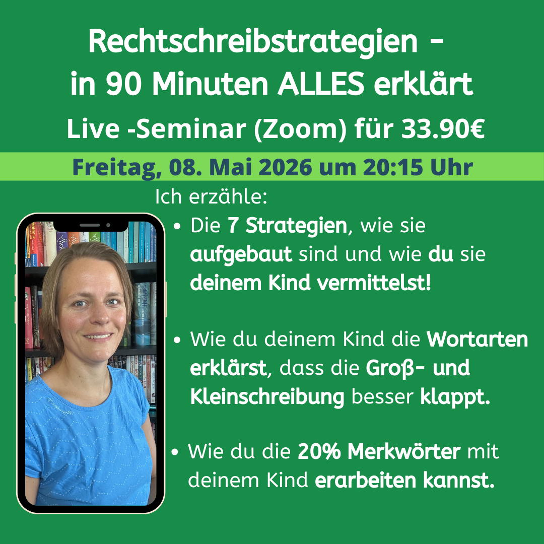Meine Leidenschaft sind die Rechtschreibstrategien. Ich liebe es Eltern dabei anzuleiten, dass ihre Kinder durch die Rechtschreibstrategien mit Leichtigkeit richtig schreiben lernen.