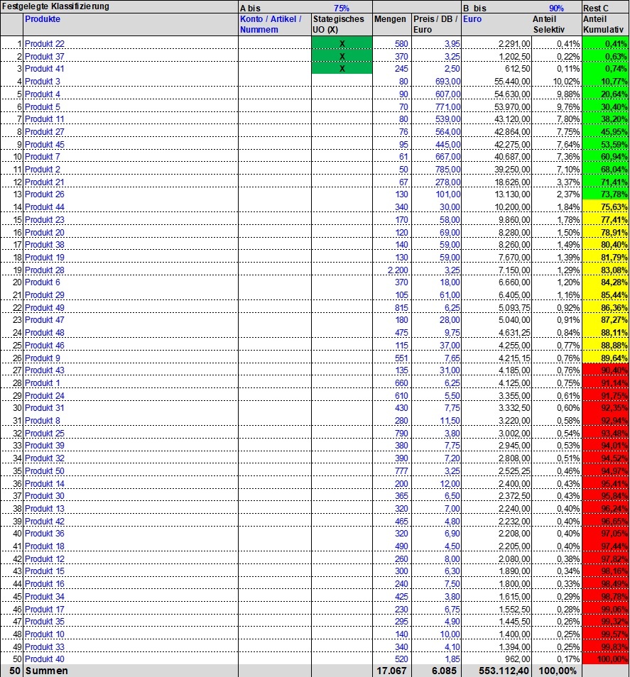 In der Datei besteht die Möglichkeit, strategisch relevante Produkte bzw. Untersuchungsobjekte mit Entwicklungspotenzial in Spalte D mit einem „X“ zu kennzeichnen. Dann färben sich die Zellen grün und man kann sofort sehen, ob es sich bei einem Untersuchungsobjekt um ein strategisch Wichtiges handelt. Die Vorgehensweise sollte v.a. angewendet werden, wenn es sich um Objekte mit geringem Volumina handelt.