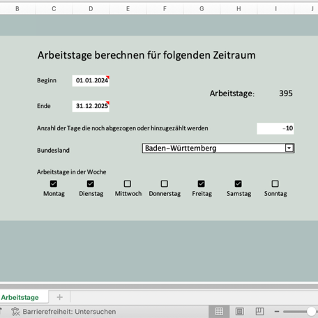 Diese Excel-Vorlage, erleichtert Arbeitstage für einen bestimmten individuell auswählbaren Zeitraum effizient zu berechnen. Feiertage, Wochenenden oder selbst definierte arbeitsfreie Tage werden automatisch herausgerechnet.
