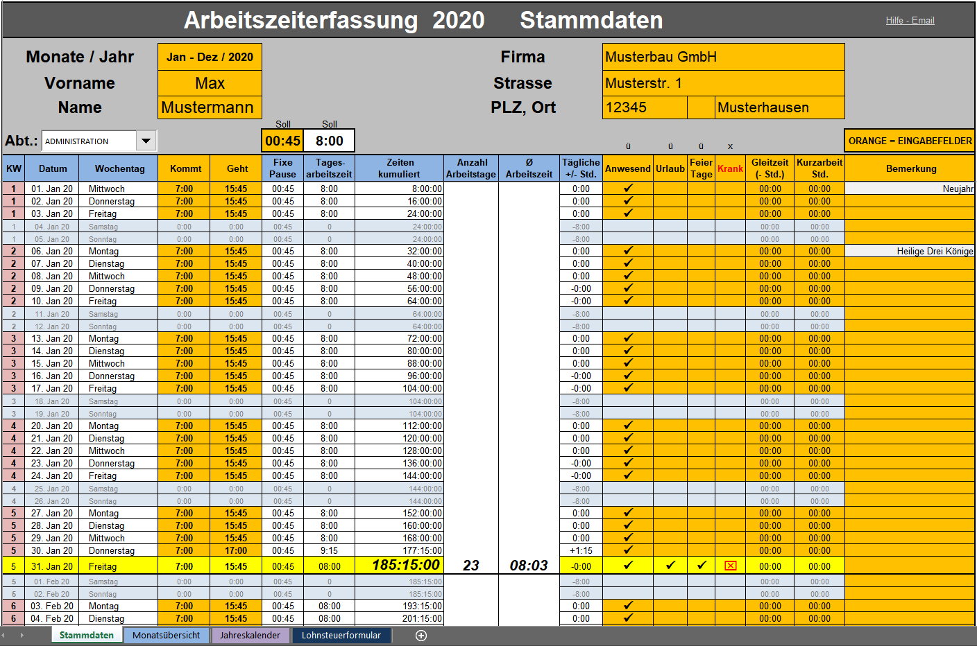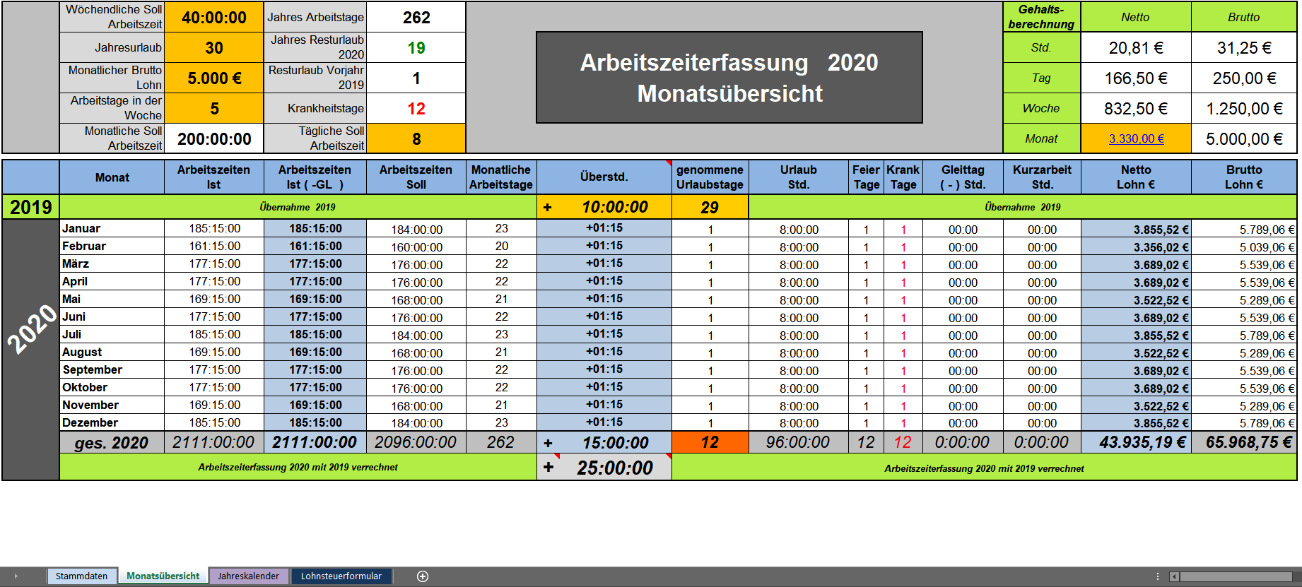 In der Monatsübersicht sind es: Soll Arbeitszeit, Jahresurlaub, Brutto Lohn, Arbeitstage in der Woche, Tägliche Soll Arbeitszeit, Monatlicher Nettolohn kann über den Link per Bruttolohn Eingabe berechnet werden.