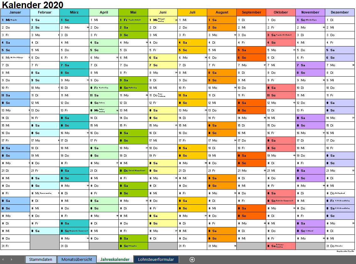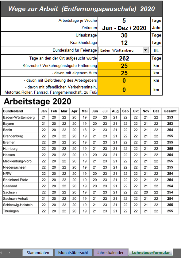 Dies sind Parameter für die Berechnung der Lohn bzw. Einkommensteuer. Hierbei werden die Orangene - Felder ausgefüllt (siehe Voreinstellungen) und die Weiße - Felder automatisch ergänzt. Mit dabei, eine Liste der Arbeitstage für jedes Bundesland.