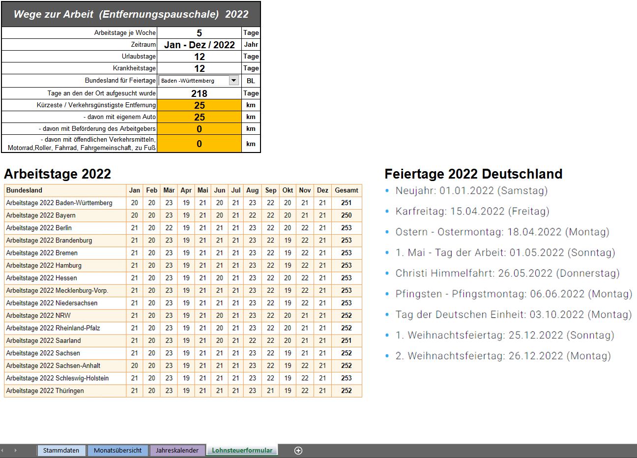 Dies sind Parameter für die Berechnung der Lohn- bzw. Einkommensteuer. Hierbei werden die Orangene - Felder ausgefüllt (siehe Voreinstellungen) und die Weiße - Felder automatisch ergänzt. Mit dabei, eine Liste der Arbeitstage für jedes Bundesland 2018.