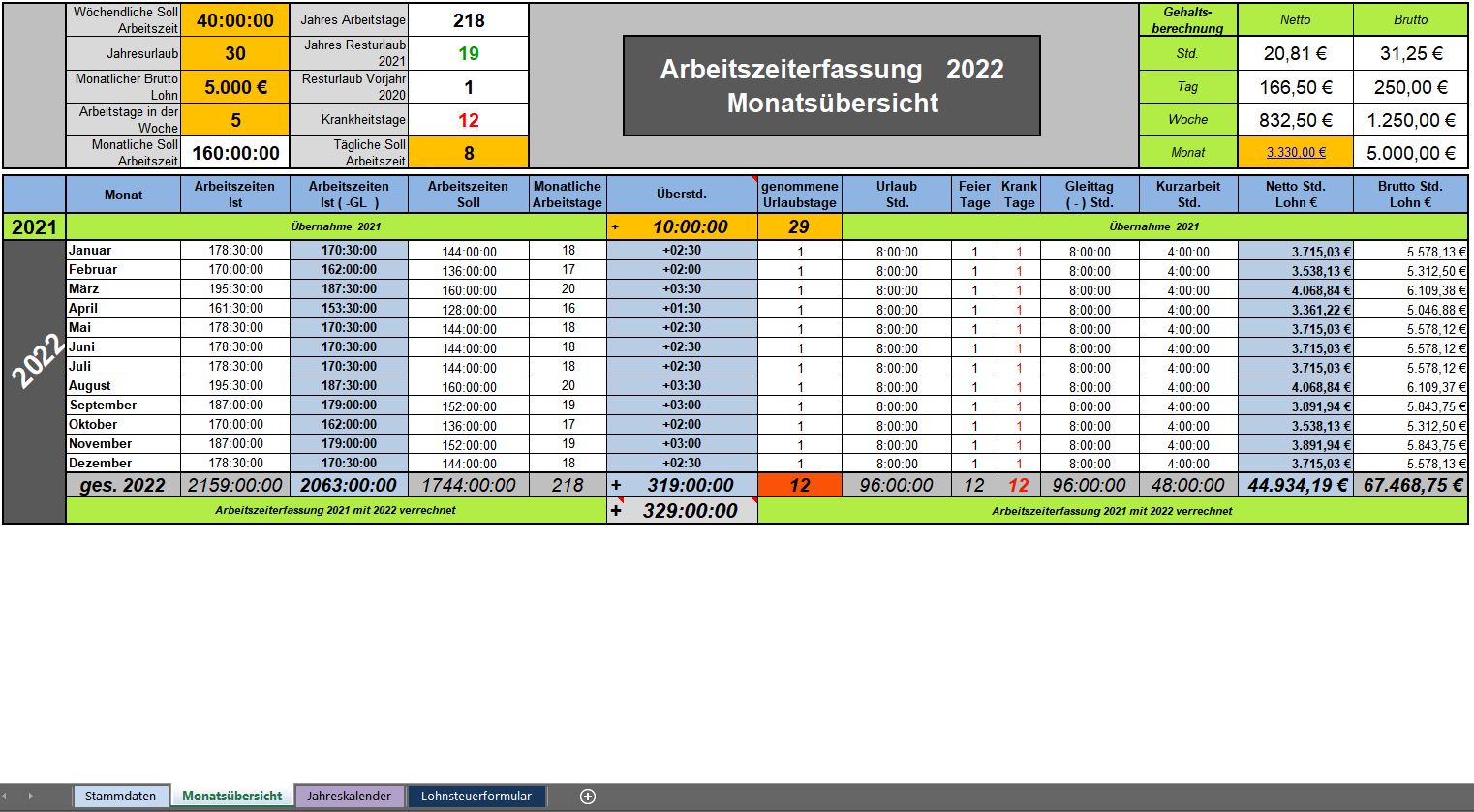 In der Monatsübersicht sind es: Soll Arbeitszeit, Jahresurlaub, Brutto Lohn, Arbeitstage in der Woche, Tägliche Soll Arbeitszeit, Monatlicher Nettolohn kann über den Link per Bruttolohn Eingabe berechnet werden. Lohnsteuerformular werden die Entfernung, Auto, Geschäftswagen, alternative Verkehrsmittel ausgefüllt.