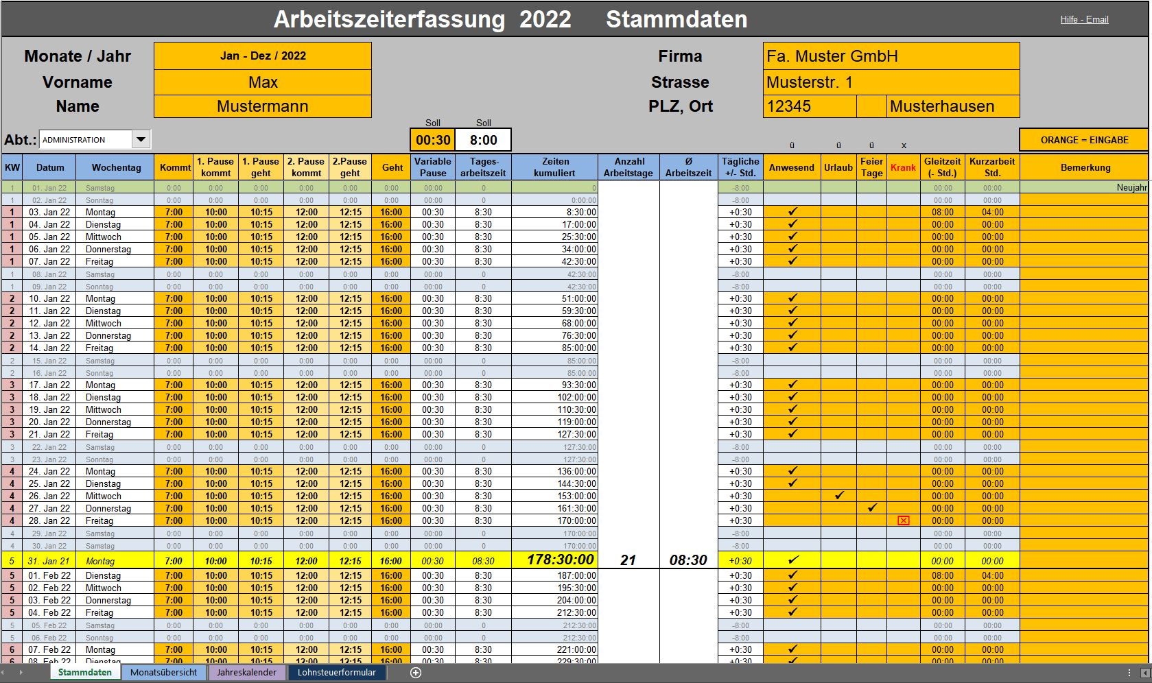 In den Stammdaten wird folgende Felder zur Voreinstellung eingegeben. Jahr, Vorname, Name, entsprechende dazugehörige Abteilung auswählen, Firma, Straße, PLZ Ort, Soll Pause.