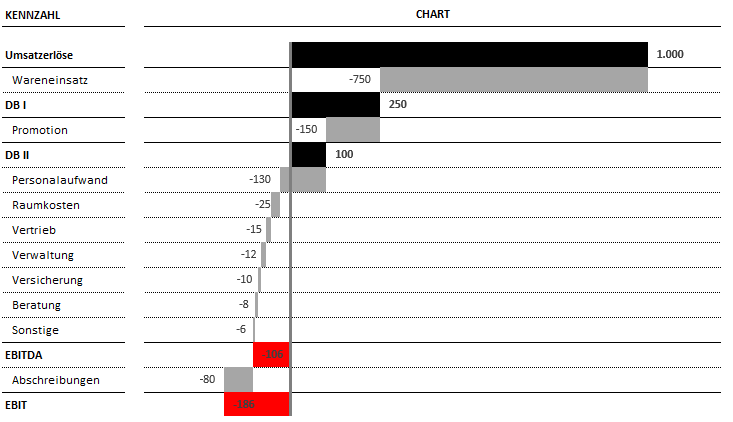 In diesem Excel Tool werden die Daten einer BWA in einem Wasserfalldiagramm visualisiert. Somit kann schneller erkannt werden, in welchem Bereich die größten Aufwendungen anfallen, oder bereits ein negatives Ergebnis erzielt wird. Auch wenn das EBITDA oder EBIT hier negativ sind, wird dies im Diagramm berücksichtigt (vgl. Bilder).