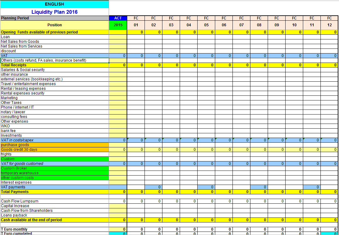 - Diese Excel-Vorlage ist für eine Monats-Cashflow-Planung bestimmt und besteht aus einem Eingabeblatt sowie einer Grafik-Blatt. Sie ist geeignet für jedes Unternehmen, das einfach und flott die Cashflow-Planung erstellen möchte. Zunächst wählen Sie oben links in der Zelle B4 eine der passenden Sprachen (Deutsch, Englisch, Russisch). Damit kann ein Unternehmen diese Planung bei den Auslands-Niederlassungen verwenden.