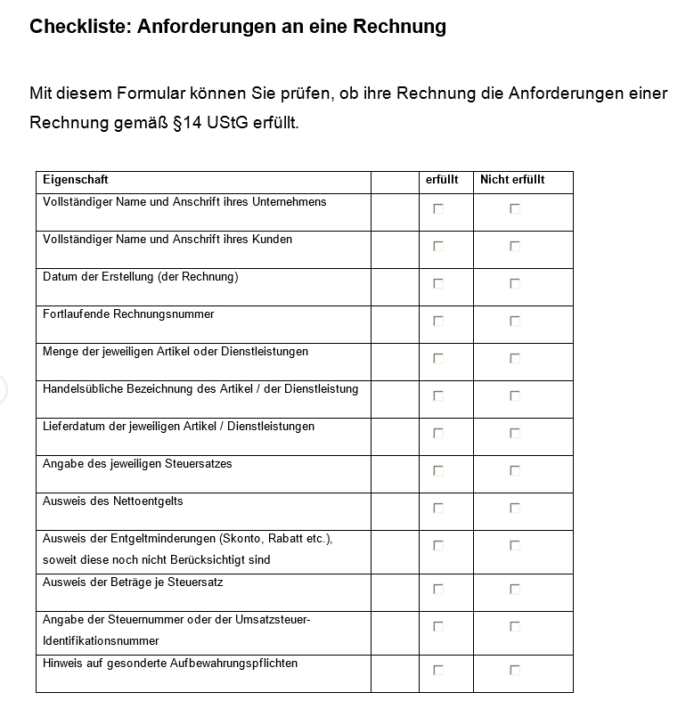 Mit Hilfe dieser Checkliste können Sie prüfen, inwiefern eine Eingangsrechnung den Anforderungen nach dem Umsatzsteuergesetzt entspricht. Als Ergänzung ist ein Musterschreiben beigefügt, das Sie bei nicht ordnungsgemäßen Rechnungen für den Versand an den Rechnungsersteller verwenden können.