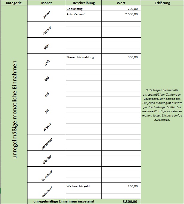 - Einnahmen (Sonder): Für die Eintragung der unregelmäßigen Einnahmen