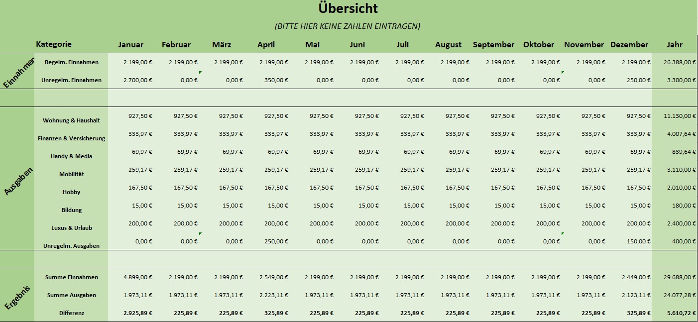 Finden Sie mit dem Excel-Tool "Einnahmen-Ausgaben-Übersicht für den privaten Haushalt in Excel" Ihre versteckten "Haushalts-Goldtöpfe"! Diese klar strukturierte Vorlage ermöglicht Ihnen einen allumfassenden Überblick über Ihre Einnahmen und Ausgaben im privaten Bereich. Die Handhabung ist simpel und schnell. Aufgrund von Beispieleinträgen ist schnell klar, welche Eingaben gemacht werden müssen. Innerhalb weniger Minuten schaffen Sie sich einen genauen Überblick.