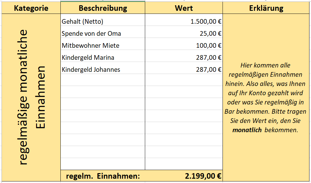 - Einnahmen (regelm.): Für die Eintragung der regelmäßigen Einnahmen