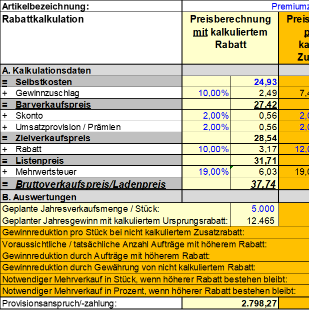 Excel-Arbeitshilfe mit der die Auswirkung von Rabatten anhand einer Preiskalkulation auf die Gewinnmarge je Stück, aber auch für das Gesamtunternehmen dargestellt werden kann. Die Vorlage beinhaltet eine Preisberechnung mit kalkuliertem Rabatt in verschiedenen Szenarien. Zur Simulation kann der Rabattsatz beliebig geändert werden und die Auswirkung auf die Gewinnmarge wird sichtbar.