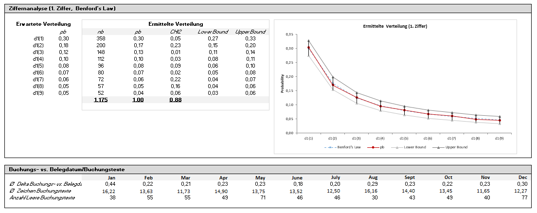 Im Funktionsumfang enthalten sind gängige Methoden wie etwa die Aufdeckung von ungewöhnlichen Verteilungen der einzelnen Buchungsvorgänge im Zeitverlauf, unübliche Ziffernverteilungen nach Benford’s Law und die Qualität der Buchungstexte. Kurzum: der Account Analyzer ermöglicht eine einfache Analyse von Kontobewegungen nach möglichen Auffälligkeiten in vertrauter Arbeitsumgebung.