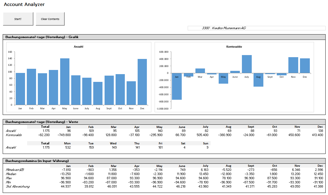 Mit dem Excel-Tool: Account Analyzer können Sie automatisiert die Buchungsbewegungen einzelner Hauptbuch- oder Nebenbuchkonten (z.B. größerer Kreditoren, Debitoren) auf Excel-Basis analysieren. Starten Sie das Programm (VBA-Makro) per Knopfdruck und die aus Ihrem Buchhaltungsprogramm exportierten Buchungslisten werden innerhalb von wenigen Sekunden ausgewertet.