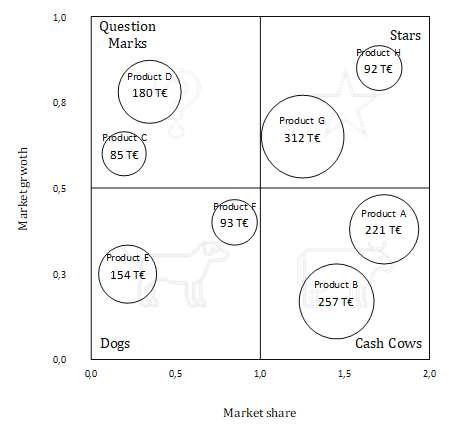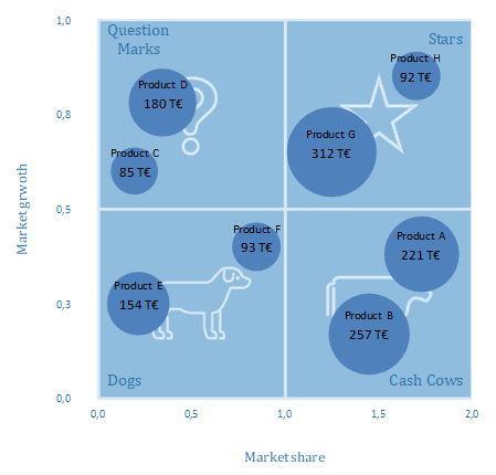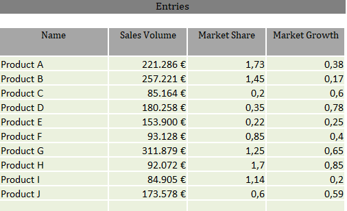 This Excel template enables you to create a portfolio matrix after the pattern of the Boston Consulting Group (also four fields matrix, growth-share matrix or BCG matrix). In a coordinate system of relative market share and market growth the products to be analyzed are displayed as circles, where the circular areas are proportional to sales.