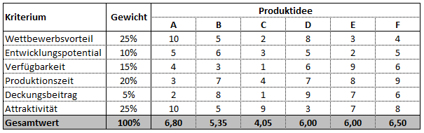 Mit dieser Excel-Vorlage bewerten Sie Ihre Produktideen anhand von 6 Kriterien in einem Scoring Modell.