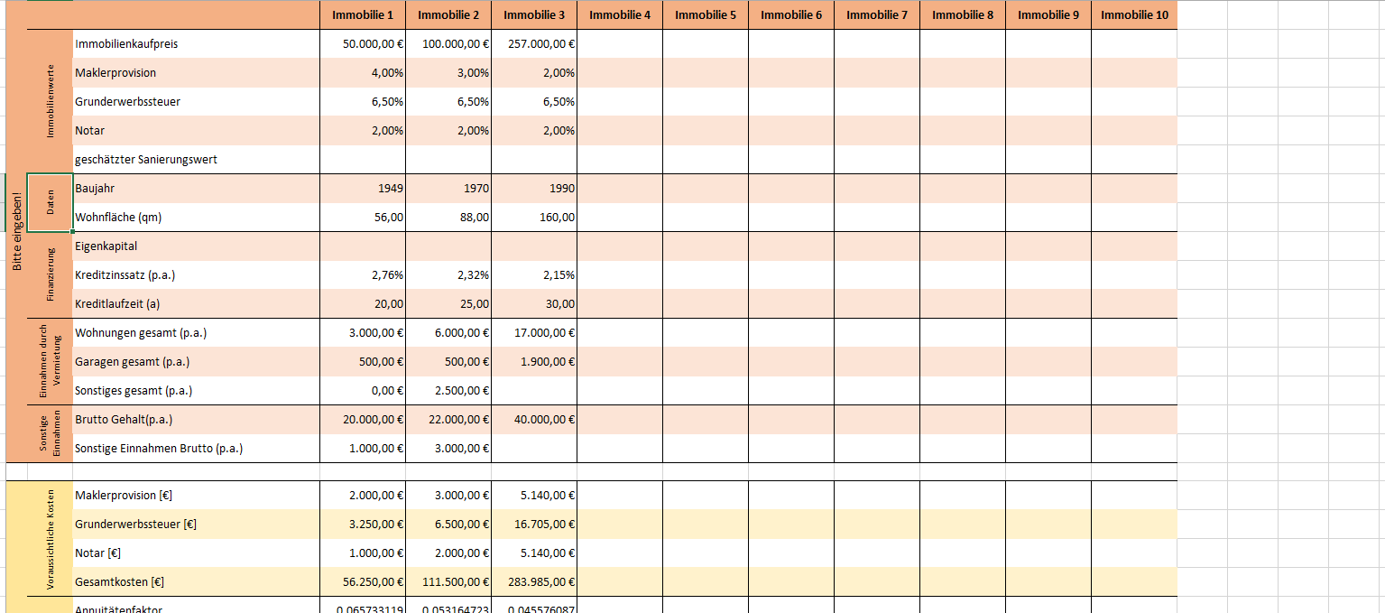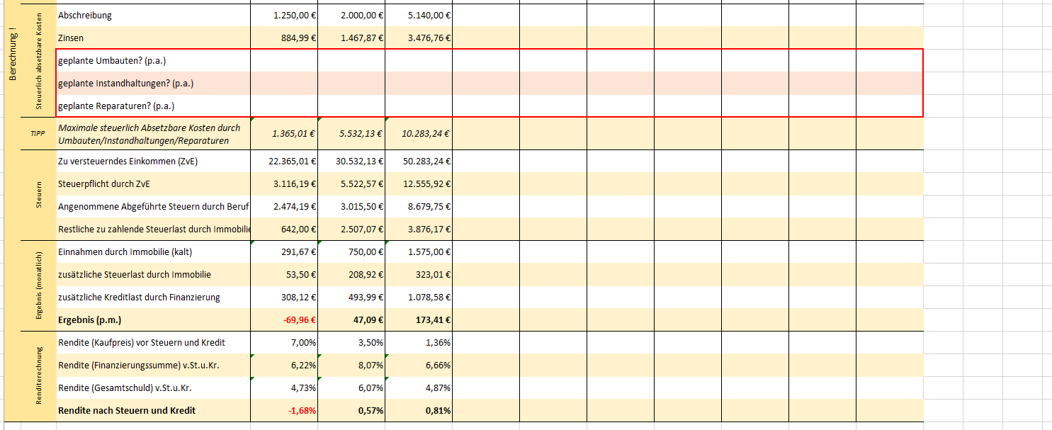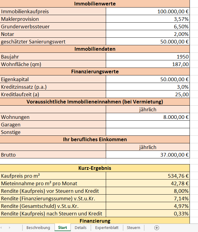 Mit dem Excel-Tool "" lassen sich ziemlich schnell erste genauere Erkenntnisse gewinnen, ob eine Immobilie eine Investition wert ist. Unter Berücksichtigung von Kredittilgung, Steuern, dem eigenen Einkommen lassen sich verschiedene Rendite-Ebenen (Vorsteuern, Nachsteuern, usw.) leicht berechnen.