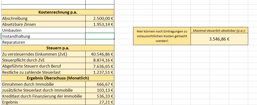 - der Einkommenssteuer inkl. möglicher anfallender Steuern durch zukünftige Immobilieneinnahmen