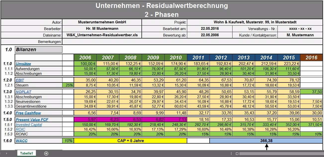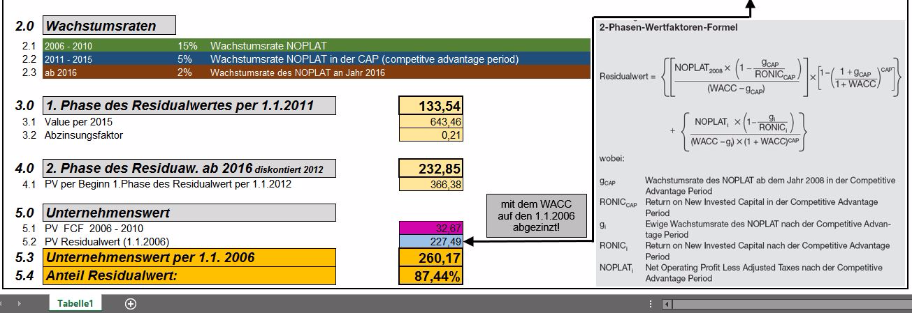 Die 2-Phasen-Wertfaktoren-Formel unterscheidet sich von der einfachen Wertfaktoren-Formel dadurch, dass sie den Residualwert in zwei Phasen aufgliedert. Nach der expliziten Planungsperiode folgt zuerst die sogenannte Competitive Advantage Periode (CAP), in der sowohl der Return on new Invested Capital (RONIC) als auch die Wachstumsrate des NOPLAT überdurchschnittlich hoch sein können, was impliziert, dass die Unternehmung in der CAP noch einen Wettbewerbsvorteil aufweist. Gleichzeitig soll diese erste Phase des Residualwertes einen sanften Übergang zur zweiten Phase ermöglichen. In der zweiten Phase erreicht dann das zu bewertende Unternehmen den eingeschwungenen langfristigen Zustand. In den meisten Fällen bedeutet dies, dass das Unternehmen nur noch langsam wächst und keine Möglichkeit mehr besitzt, Übergewinne abzuschöpfen. In der Competitive Advantage Periode wächst der FCF des darstellten Unternehmens mit 5% und der RONIC beträgt 15%. Ab 2016 verlangsamt sich das Wachstum des auf 2% und die Rendite kommt auf die Höhe der Kapitalkosten zu liegen (ROIC = WACC). Aus dieser Konstellation resultiert ein Unternehmenswert zum 2006 von 260. Die Anwendung des 2-Phasen-Wertfaktoren-Formel stellt dabei sicher, dass bewusst mit der Höhe des ROIC in Relation zu den Kapitalkosten (WACC) umgegangen wird. Zudem werden dem geplanten Wachstum adäquate Neuinvestitionen berücksichtigt und der Übergang von 15% Wachstum zum „ewigen Wachstum“ von 2% wird über mehrere Jahre in der CAP vollzogen. Nachteile dieser Residualwertformel trotz einer CAP gibt es auch mittels 2-Phasen-Wertformel keinen kontinuierlichen Abbau der Wachstumsgröße von 15% in der expliziten Planungsperiode auf 2% in der zweiten Phase der Residualwertbetrachtung. Der Bruch in der Wachstumsrate erfolgt hier zweistufig.