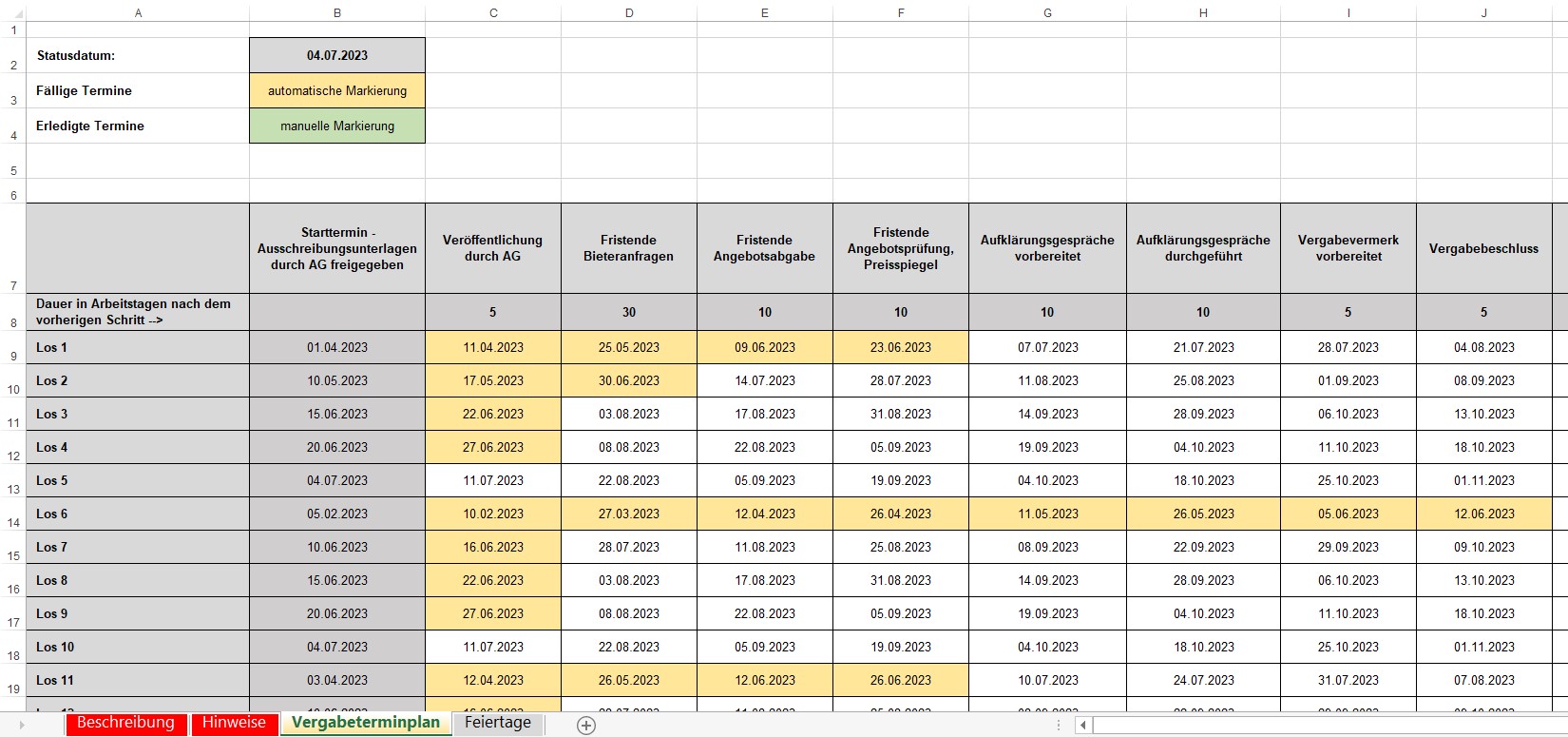 Das Aufstellen eines Vergabeterminplans ist eine Grundleistung der Leistungsphase 6 - Vorbereitung der Vergabe gemäß der Honorarordnung für Architekten und Ingenieure (HOAI). Um den einheitlichen Ablauf der Vergabe für jede Vergabeeinheit (Los) im Projekt zu gewährleisten, eignet sich eine Excel-Matrix als geeignete Darstellungsform für den Vergabeterminplan. Diese Matrix stellt eine übersichtliche Alternative zum Gantt-Diagramm dar und bietet den Vorteil, dass keine spezielle Terminplanungssoftware erforderlich ist.