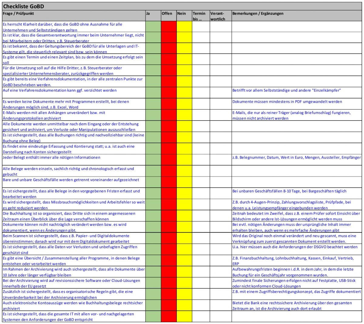 In der Checkliste sind noch einmal grundlegende Anforderungen der GoBD festgehalten. Bei der Umsetzung müssen zwingend die individuellen Sachverhalte des Betriebes berücksichtigt und die Punkte konkretisiert und detailliert werden. Die Checkliste dient dem Einstieg in das Thema kann beliebig ergänzt und verändert werden.