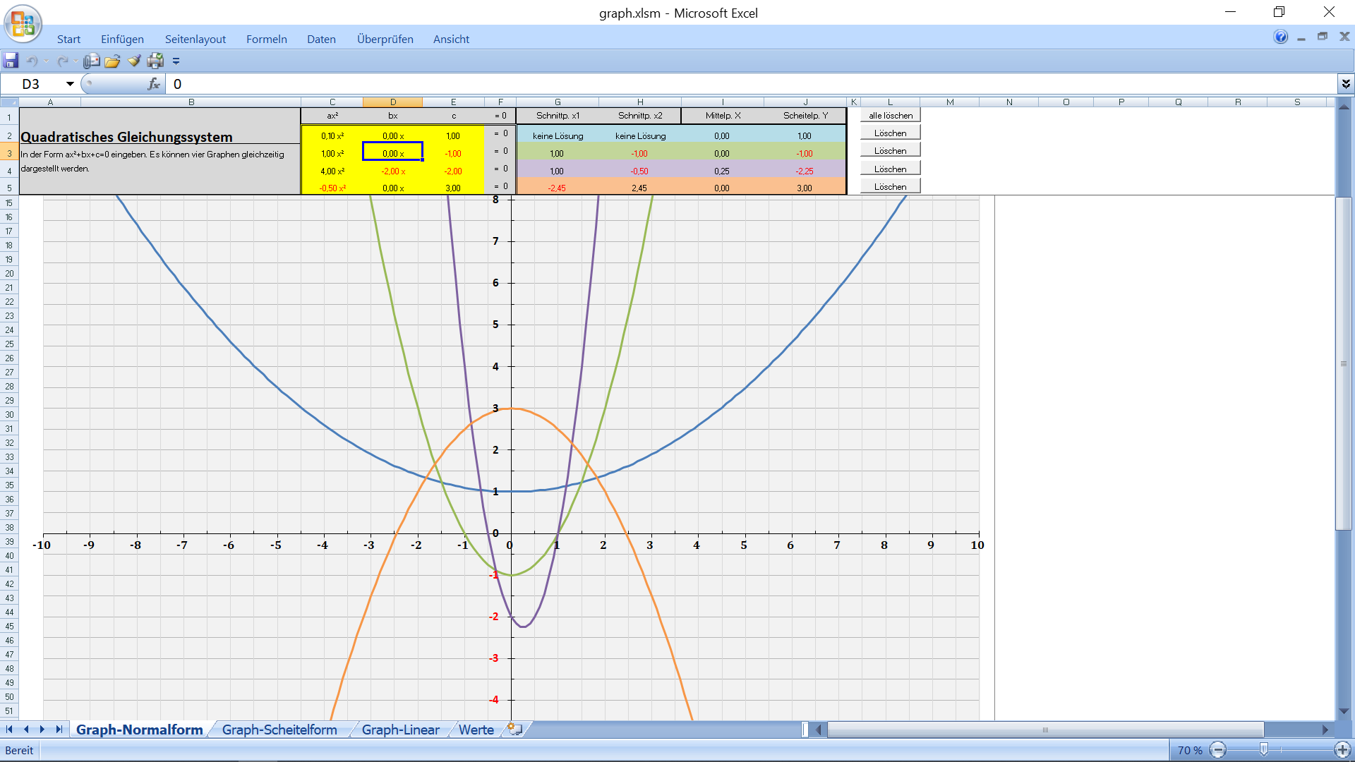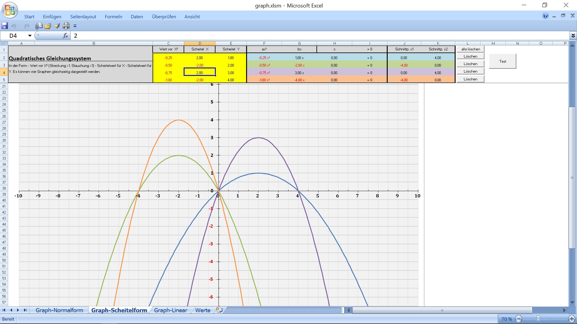 Die Arbeitsblätter Graph-Normalform und Graph-Scheitelform bieten Einträge für vier Werte einer quadratischen Gleichung, wobei im ersten Blatt die Normalform errechnet und graphisch dargestellt wird und im zweiten Blatt die Scheitelform.