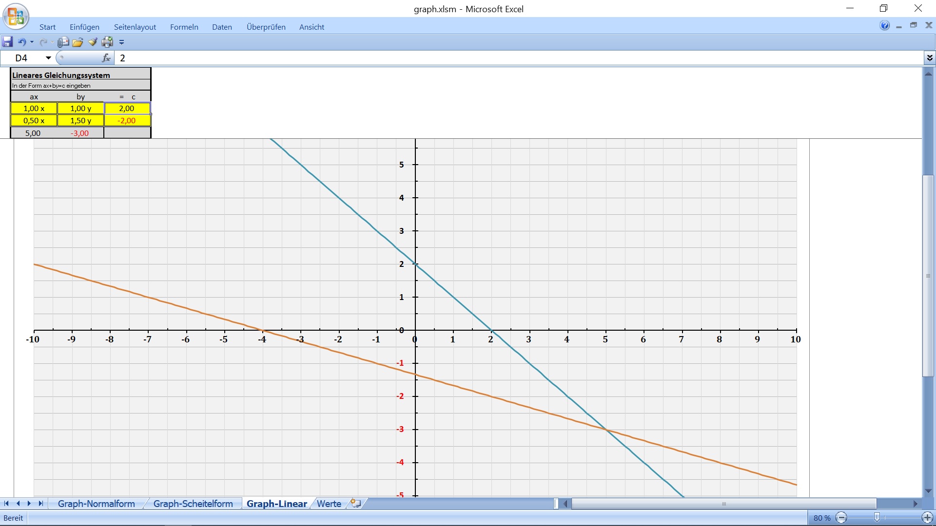 Im Arbeitsblatt Linear können lineare Gleichungsfunktionen mit zwei Variablen errechnet und graphisch dargestellt werden. Es können zwei Graphen dargestellt werden.