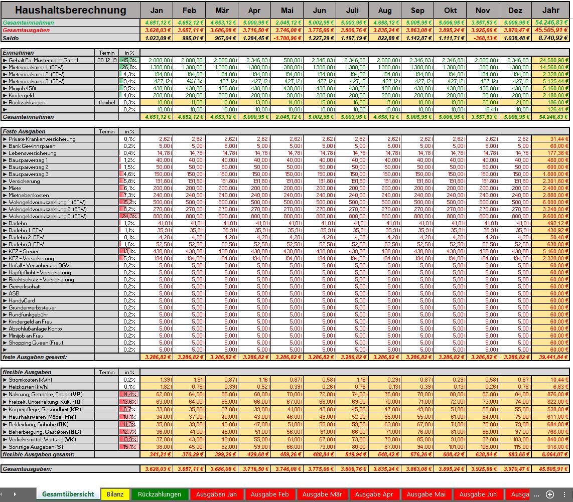 Auf dem Gesamtübersichtstabellenblatt befindet sich die Jahresübersicht ihrer Einnahmen & Ausgaben. Bevor Sie beginnen ihre Daten einzutragen, gehen Sie zunächst ihre Finanzunterlagen und Kontoauszüge durch, um möglichst alle festen Ausgaben aufzuspüren. Anschließend vergleichen Sie ihre so ermittelten Einnahme und Ausgabeposten mit denen im Haushaltsbuch und passen die Vorlage ihrem Haushalt an.