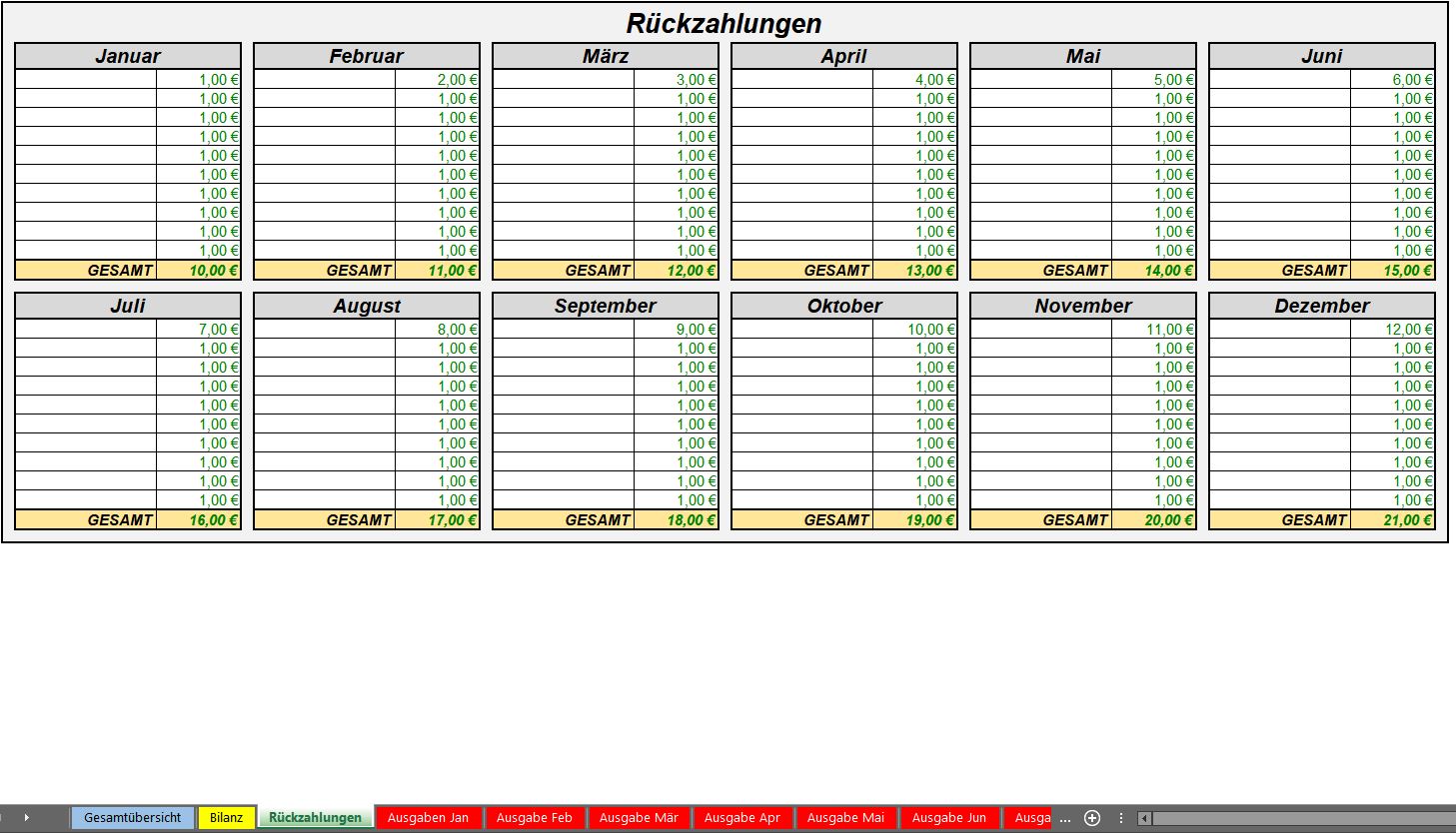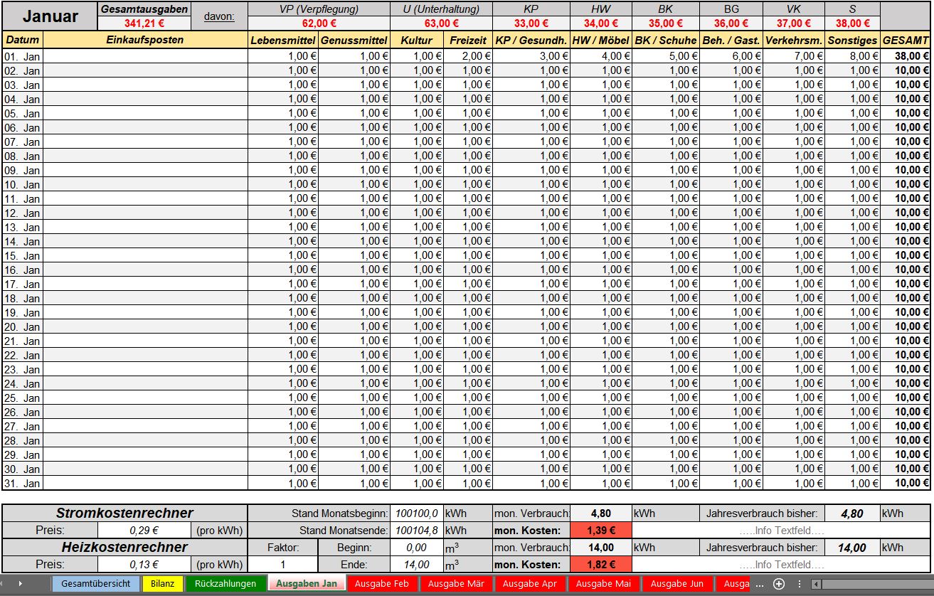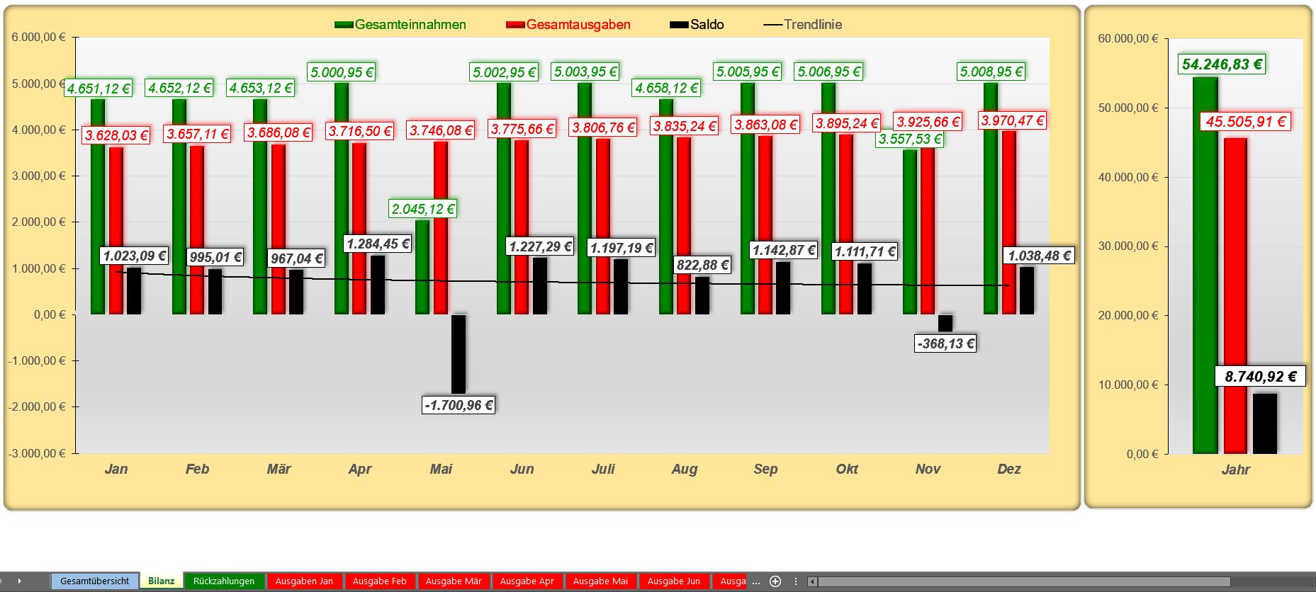 Jede Ausgabe, die Sie auf später einem Monats-Tabellenblatt eintragen, wird automatisch in die Jahresübersicht übertragen. So können Sie in der Jahresübersicht jederzeit sehen, wieviel Geld Sie im aktuellen Monat noch zur Verfügung haben und wie ihre Jahresbilanz ausschaut.