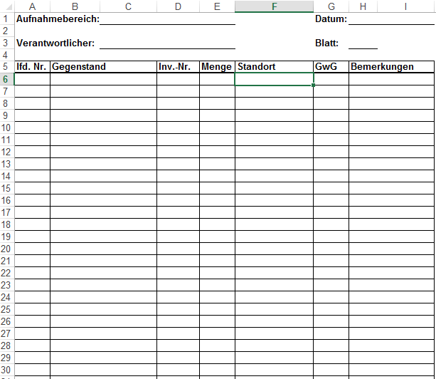 Mit dieser Inventurliste können Bestände leicht erfasst werden. Die Inventur-Vorlage wurde für MS Excel entworfen, sodass die Aufstellung des Inventars entweder direkt im Programm oder auf dem Ausdruck erfolgen kann.