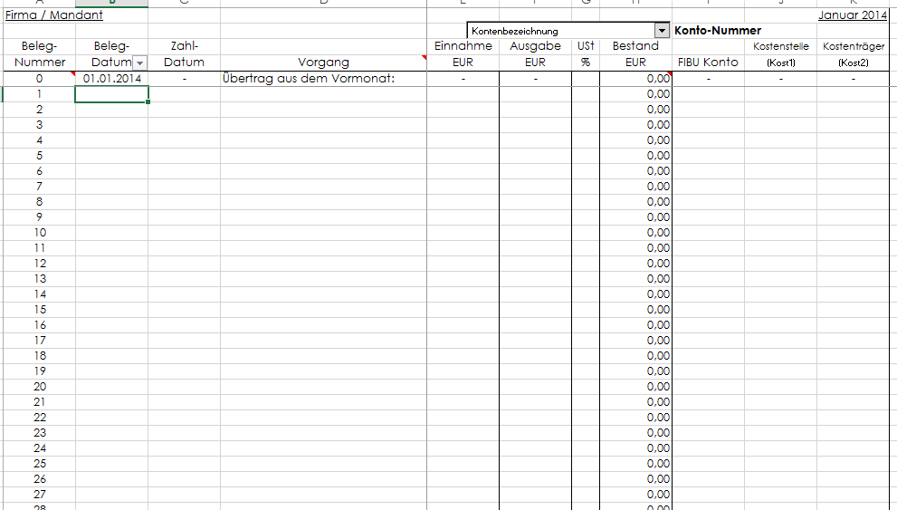 Das auf Excel basierende Kassenbuch ist weitgehend selbsterklärend, u.a. durch Kommentare zu den jeweiligen Eingabefeldern. Erfaßt werden Belegdatum, Text, Einnahme/Ausgabe, Steuersatz, FiBu-Konto und optional Kostenstelle und Kostenträger. Durch eine einfache Kopierfunktion können die Buchungen als ASCII-Datei ausgegeben und durch die bereits vorbelegten Kopfzeilen in die Buchhaltungssoftware von Lexware oder DATEV importiert werden.