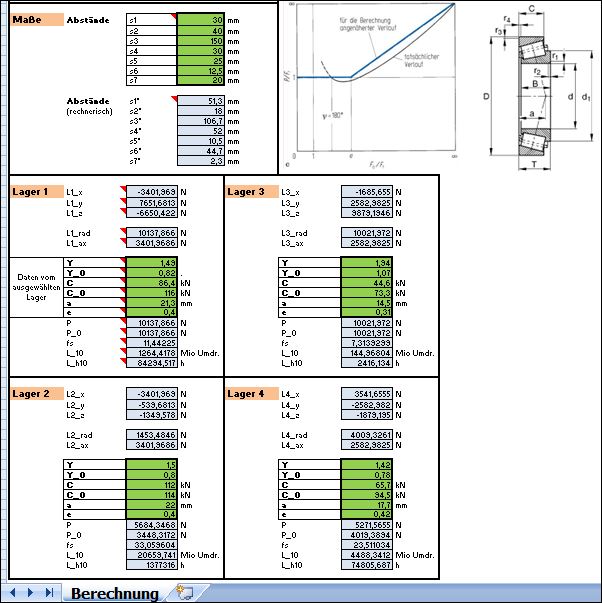 Lagerwerte (Kräfte, Lebensdauer) x, y und z - Richtung, L_10, L_10h
